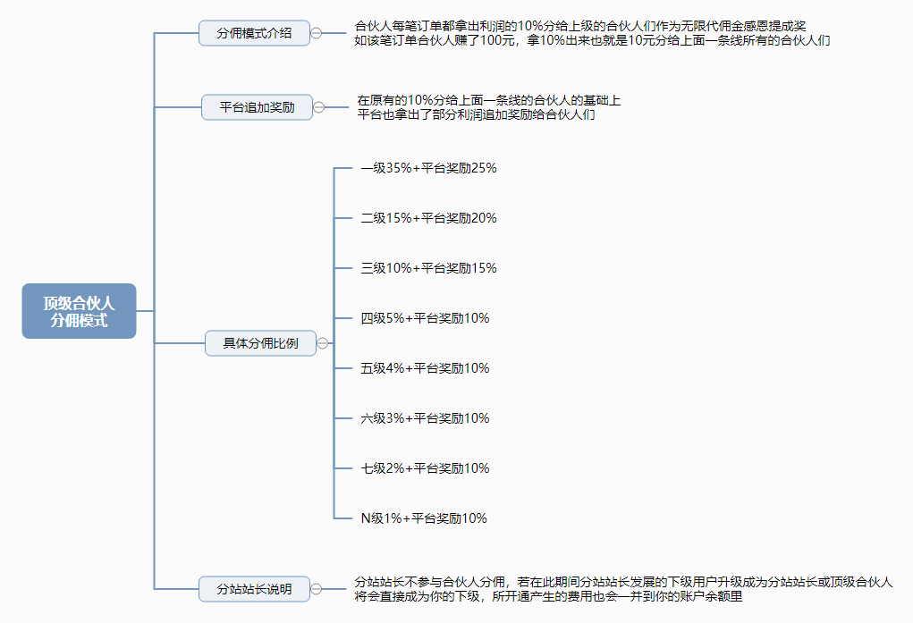 顶级合伙人享受无限代模式,具体分佣模式如下: